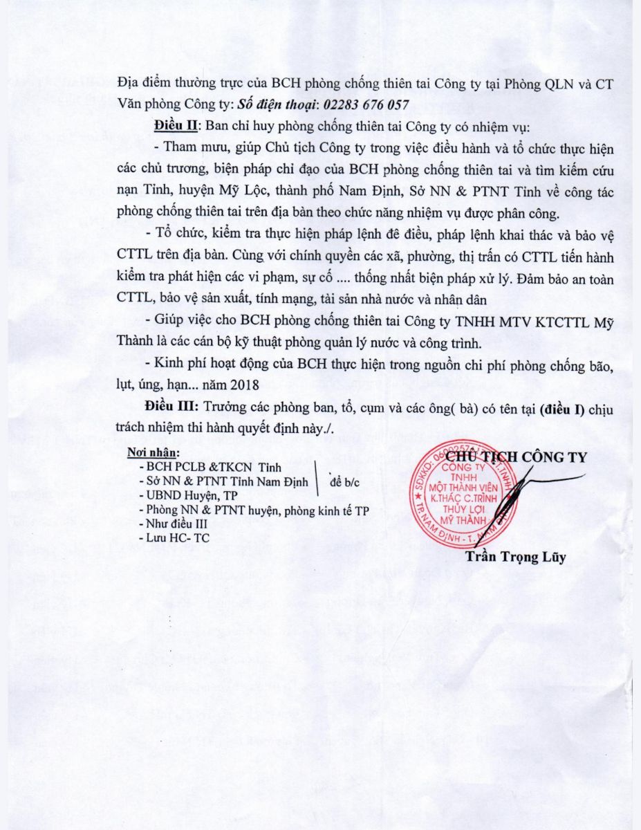 - Quyết định về việc phê duyệt danh mục, kế hoạch sửa chữa thường xuyên công trình thuỷ lợi năm 2026 của Công ty TNHH MTV KTCTTL Mỹ Thành