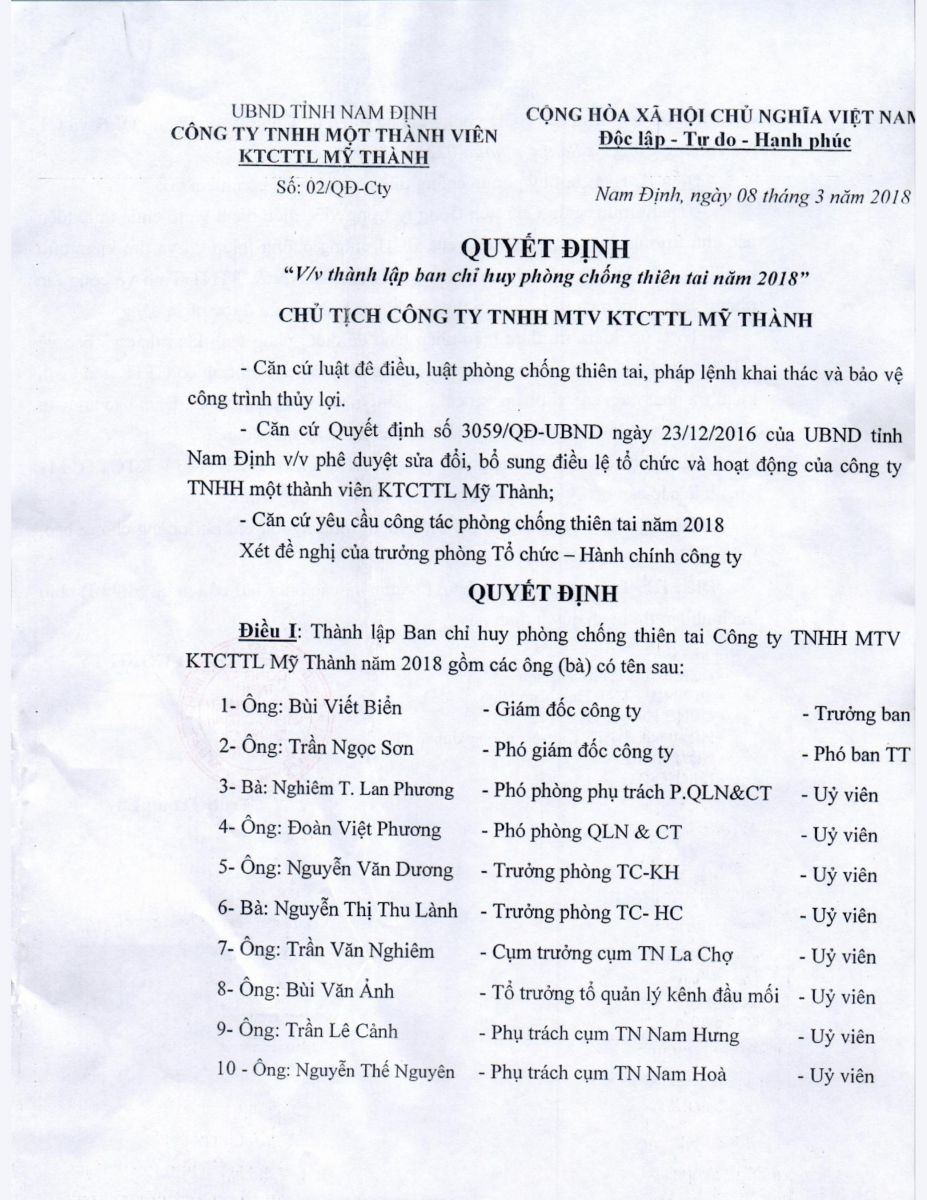 - Quyết định về việc bổ nhiệm lại chức vụ Cụm trưởng cụm thuỷ nông