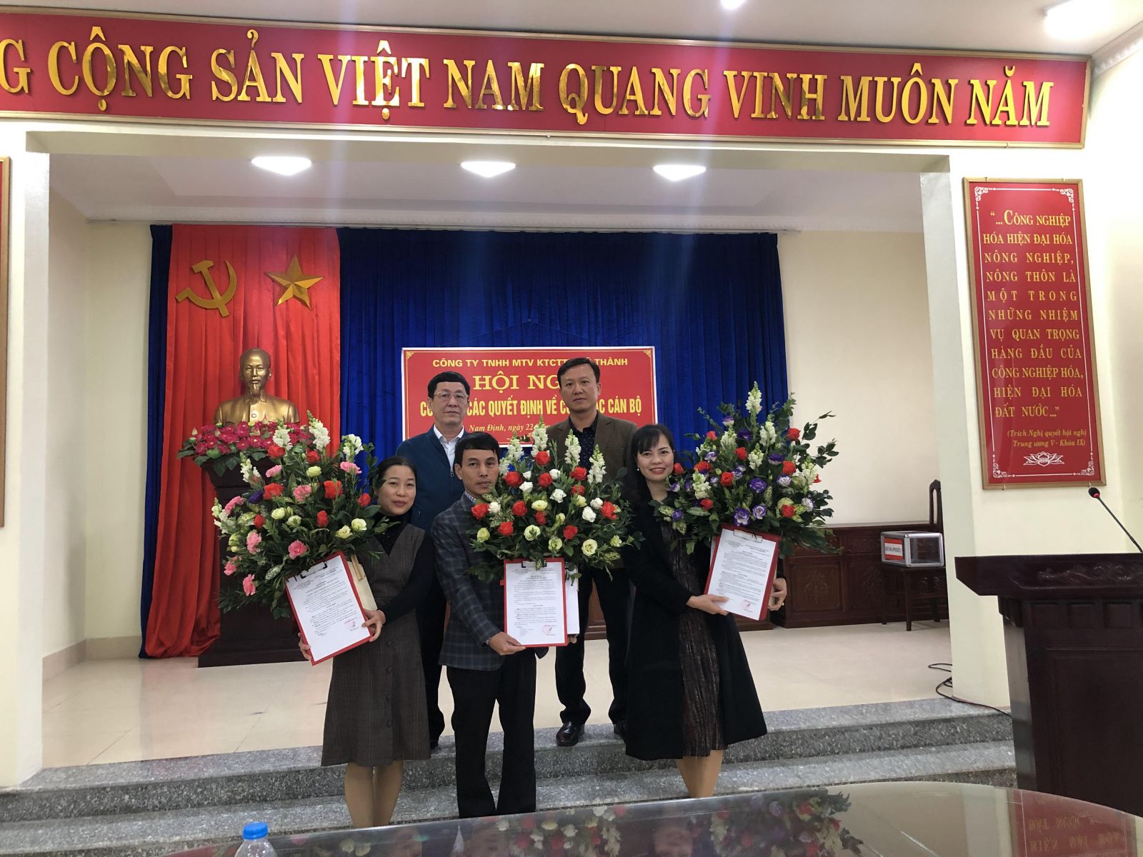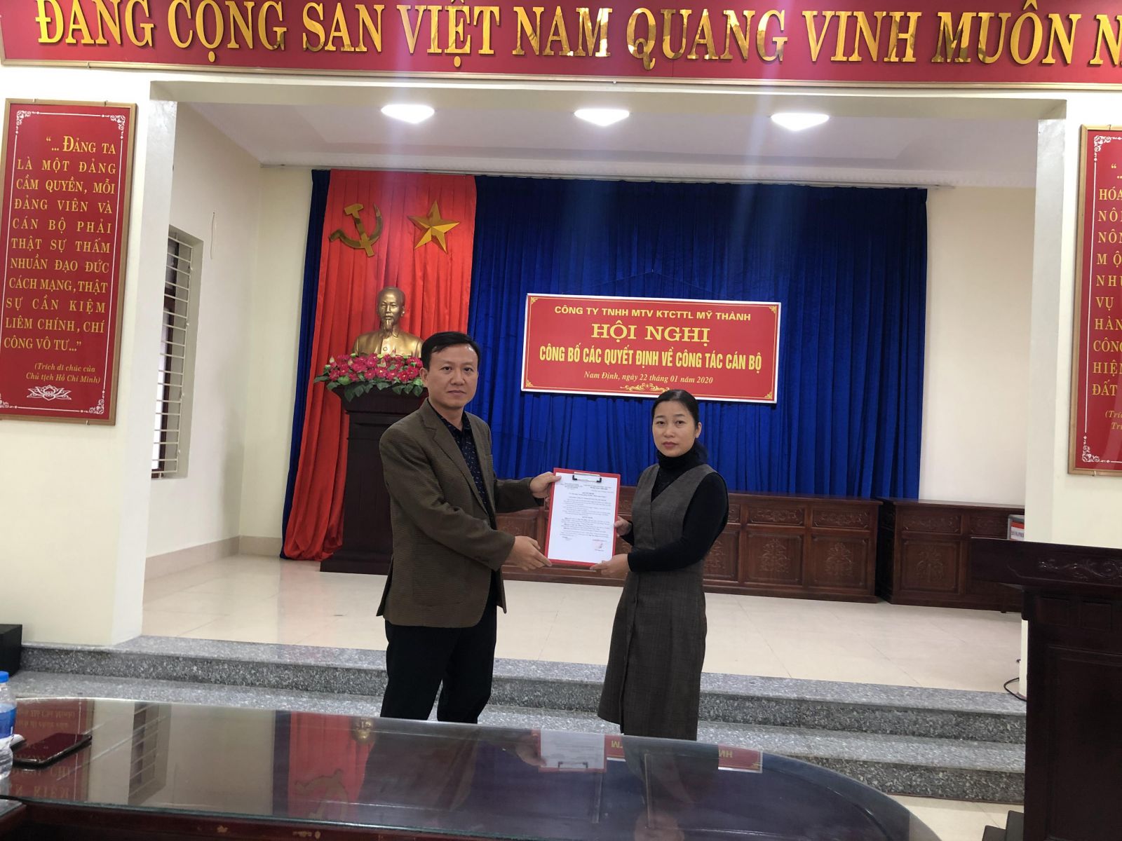 Tại hội nghị đã công bố quyết định số 05/QĐ-Cty ngày 20/01/2020 của Chủ tịch công ty TNHH MTV KTCTTL Mỹ Thành về việc bổ nhiệm PGĐ công ty đối với đồng chí Nguyễn Văn Dương, và quyết định số 05/QĐ-Cty ngày 20/01/2020 của Chủ tịch công ty TNHH MTV KTCTTL Mỹ Thành về việc bổ nhiệm kế toán trưởng công ty đối với đồng chí Nguyễn Thị Thu Lành. Đồng thời công bố quyết định số 07/QĐ-Cty của Giám đốc công ty TNHH MTV KTCTTL Mỹ Thành về việc bổ nhiệm trưởng phòng tổ chức hành chính công ty đối với đồng chí Ngô Thu Hằng