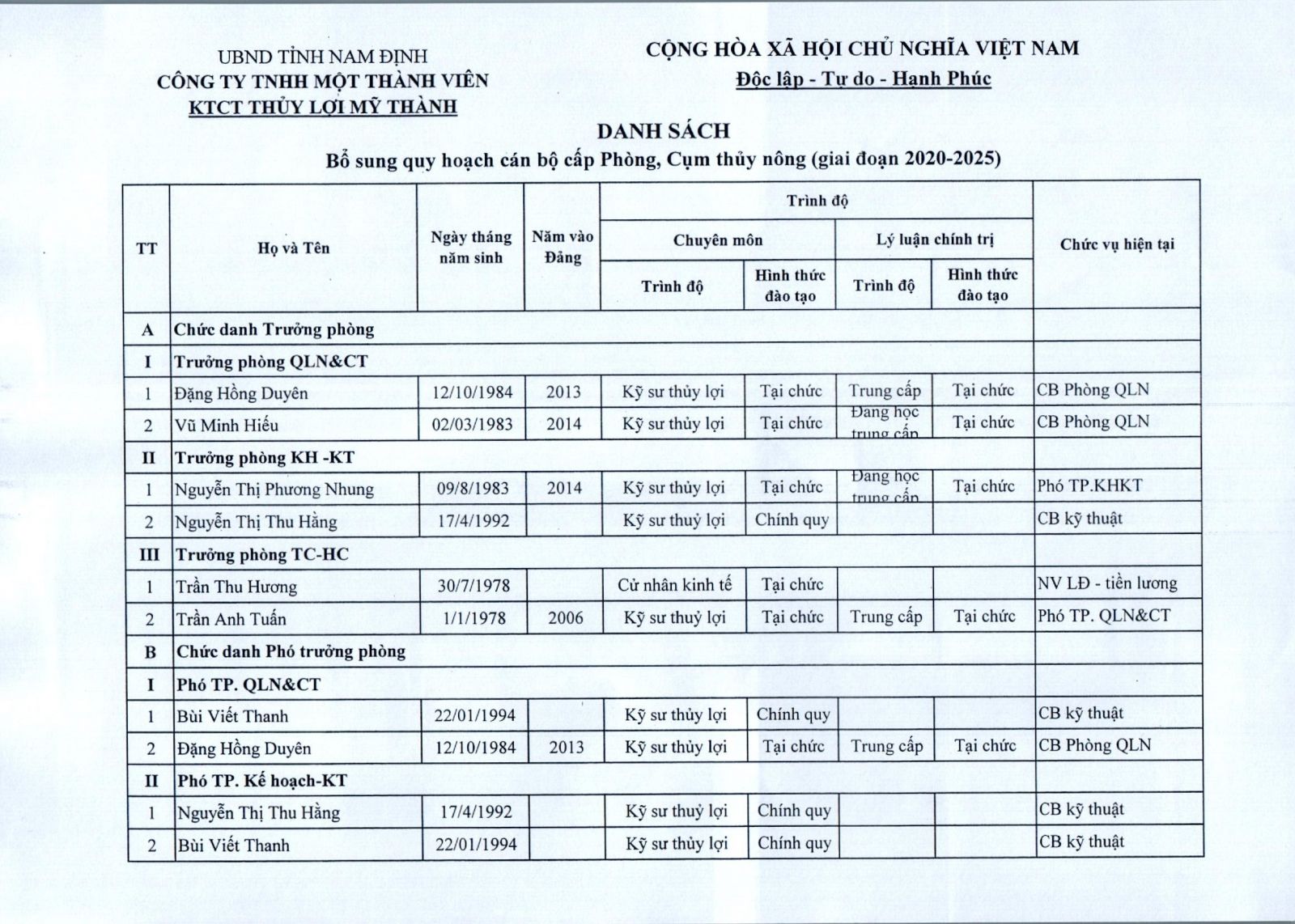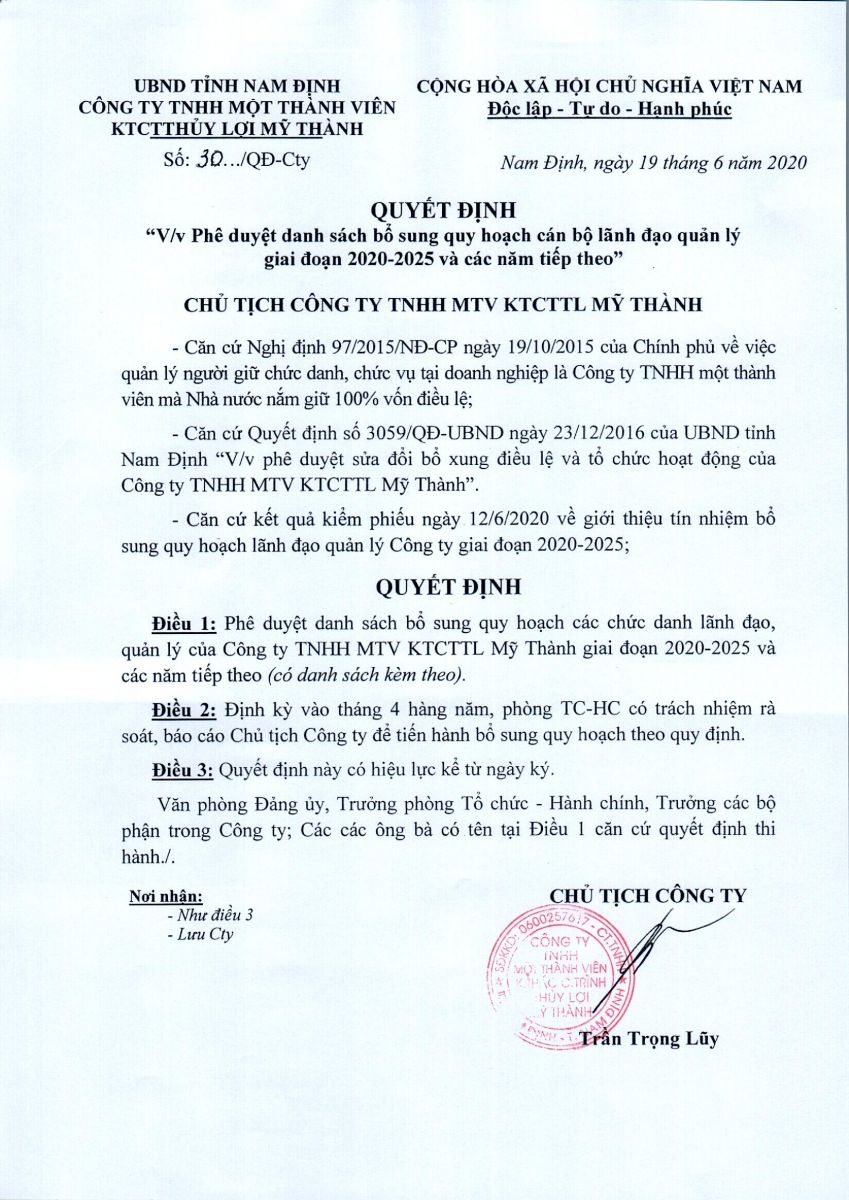- Quyết định về việc bổ nhiệm lại Trưởng phòng Quản lý nước & Công trình