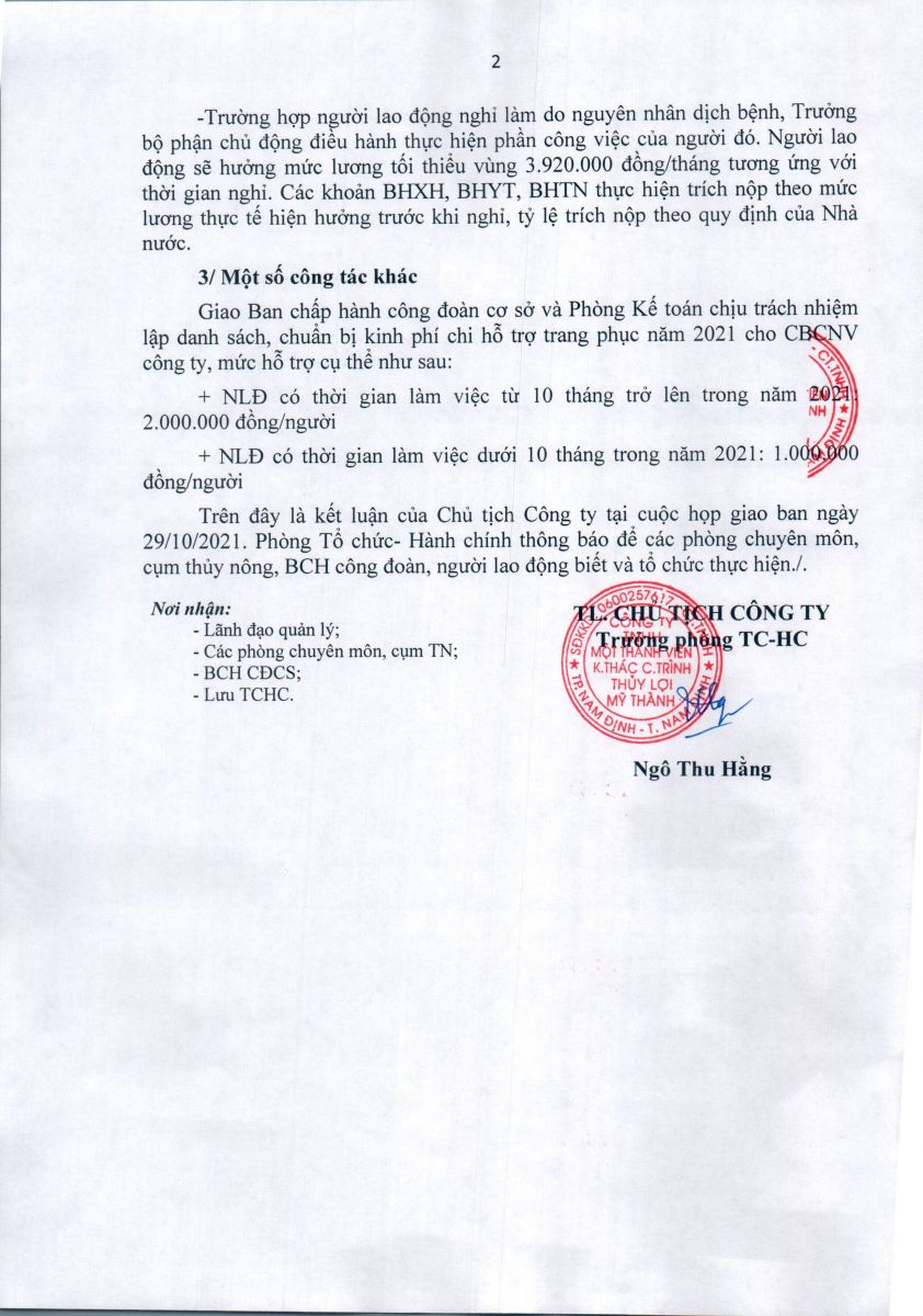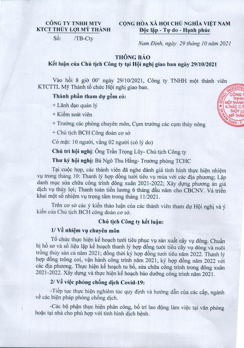 • Thông báo kết luận của chủ tịch công ty tại HNGB ngày 29/10/2021