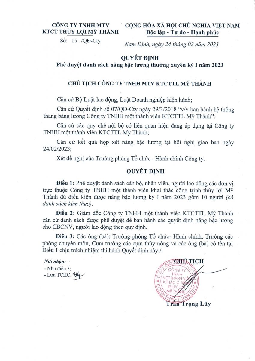 - Quyết định về việc phê duyệt danh mục, kế hoạch sửa chữa thường xuyên công trình thuỷ lợi năm 2026 của Công ty TNHH MTV KTCTTL Mỹ Thành