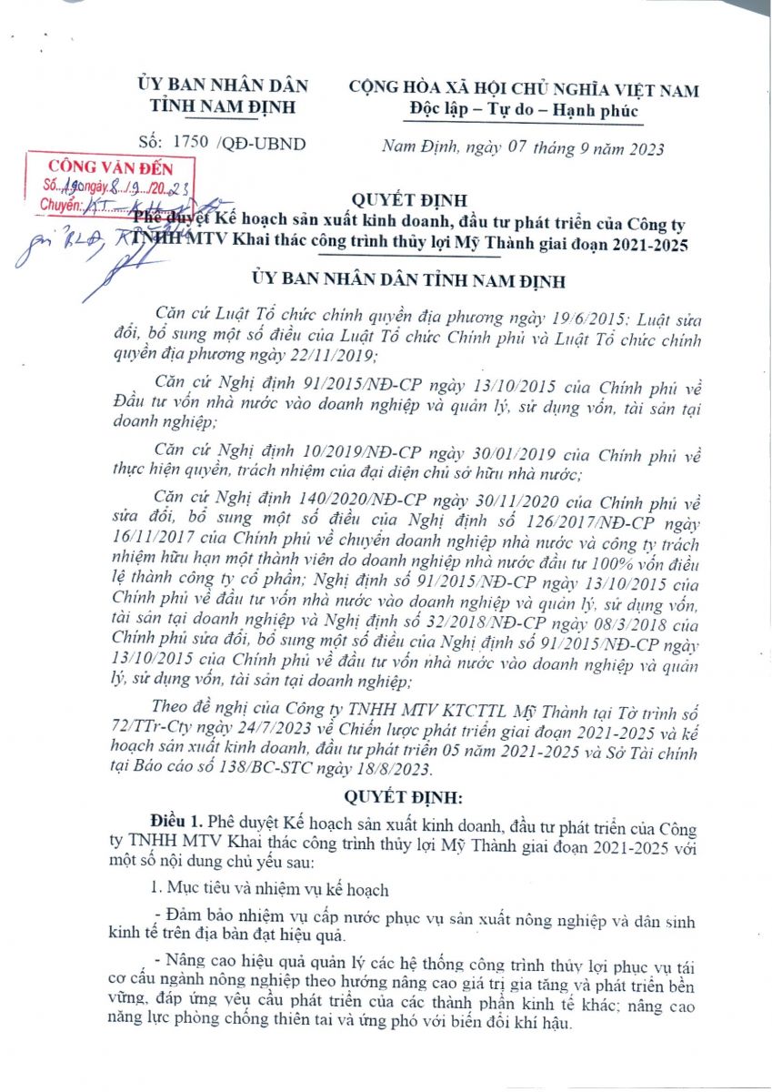 Quyết định của UBND Tỉnh Nam Định về việc giao kế hoạch năm 2025 cho Công ty 01-07-2025