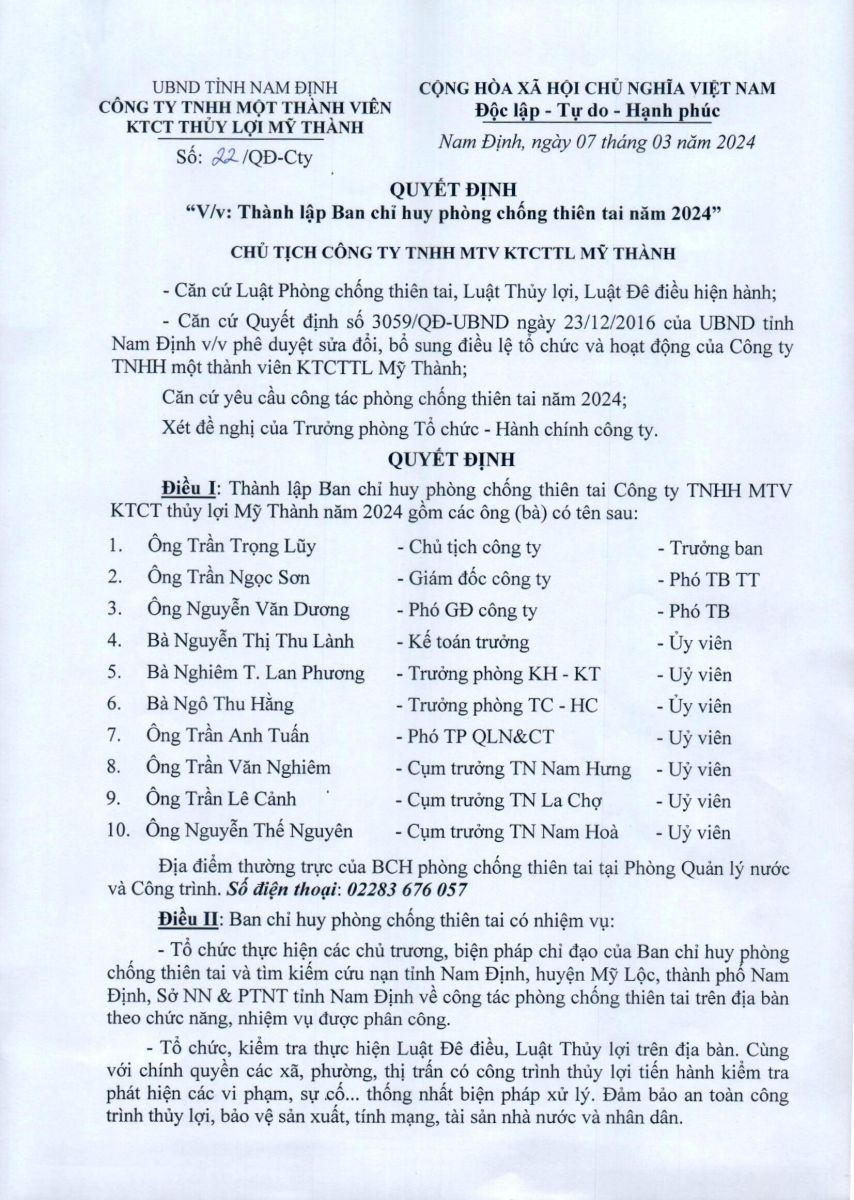 - Quyết định về việc phê duyệt danh mục, kế hoạch sửa chữa thường xuyên công trình thuỷ lợi năm 2026 của Công ty TNHH MTV KTCTTL Mỹ Thành