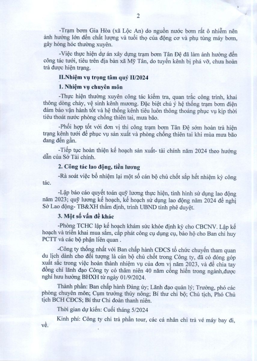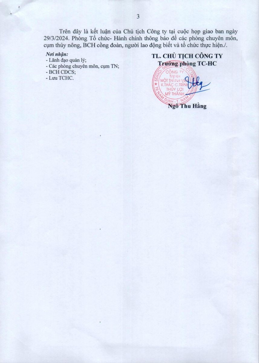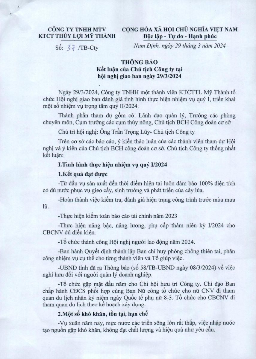 • Thông báo Kết luận của Chủ tịch công ty tại hội nghị giao ban ngày 29/3/2024