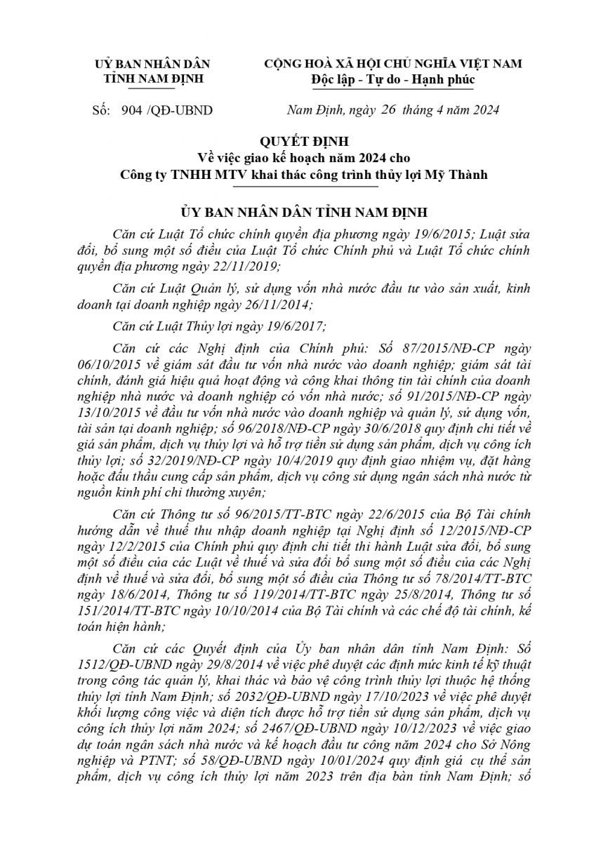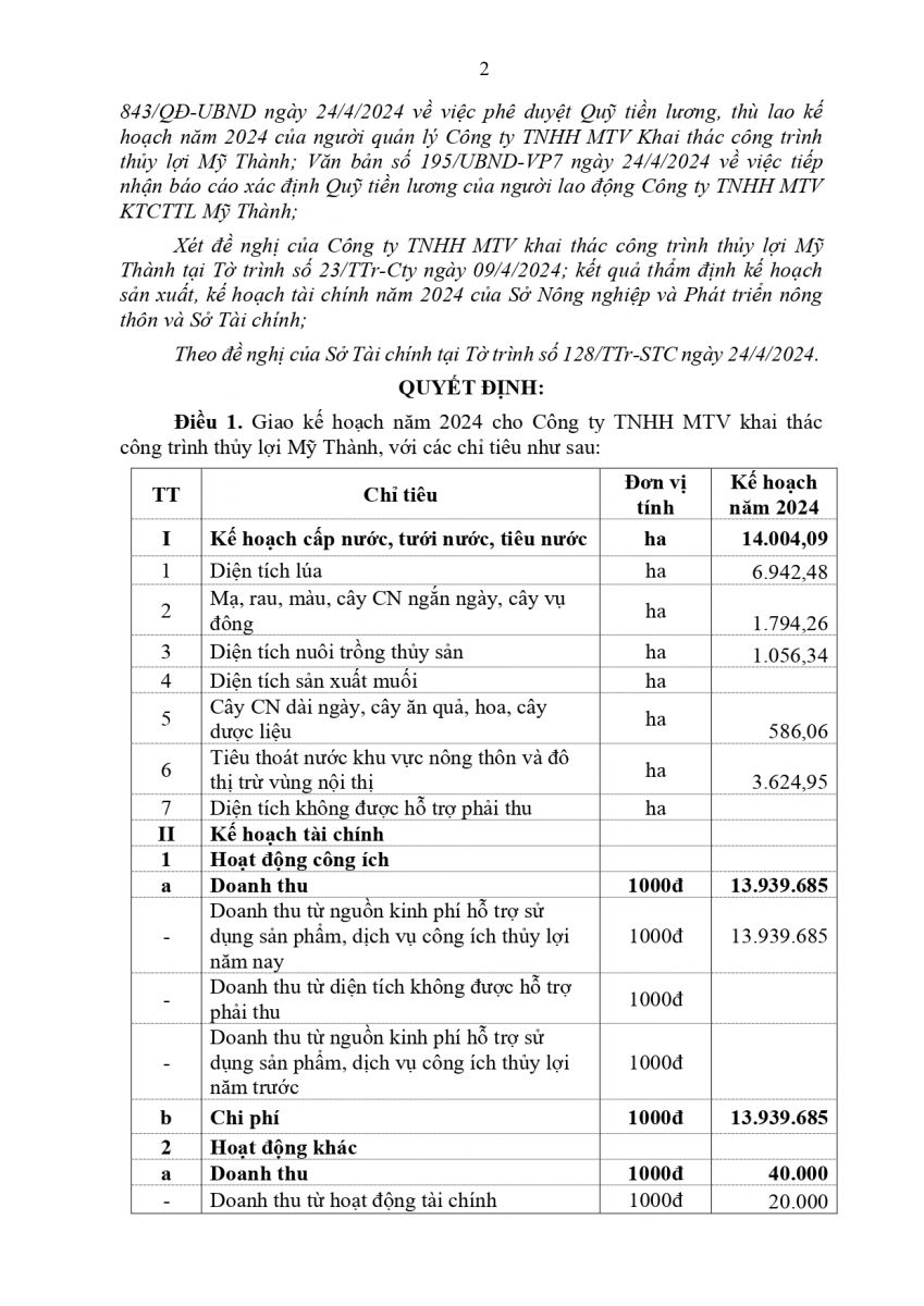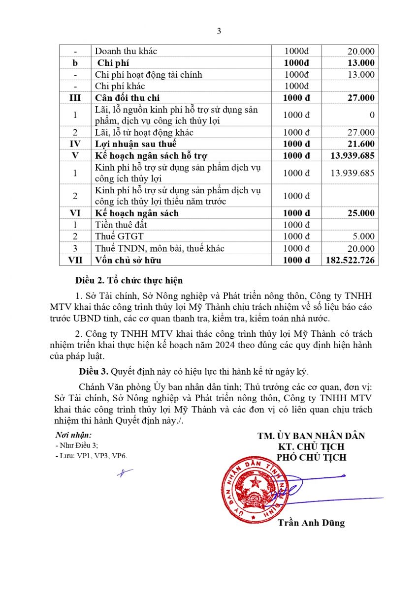 • THÔNG BÁO - Về việc giao kế hoạch năm 2024 cho công ty TNHH MTV KTCT thủy lợi Mỹ Thành