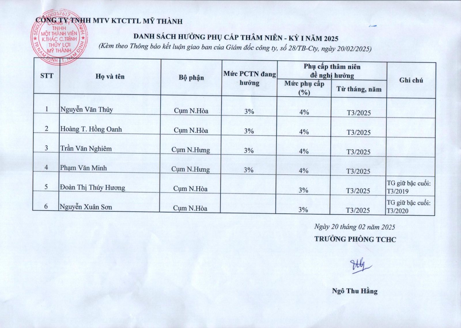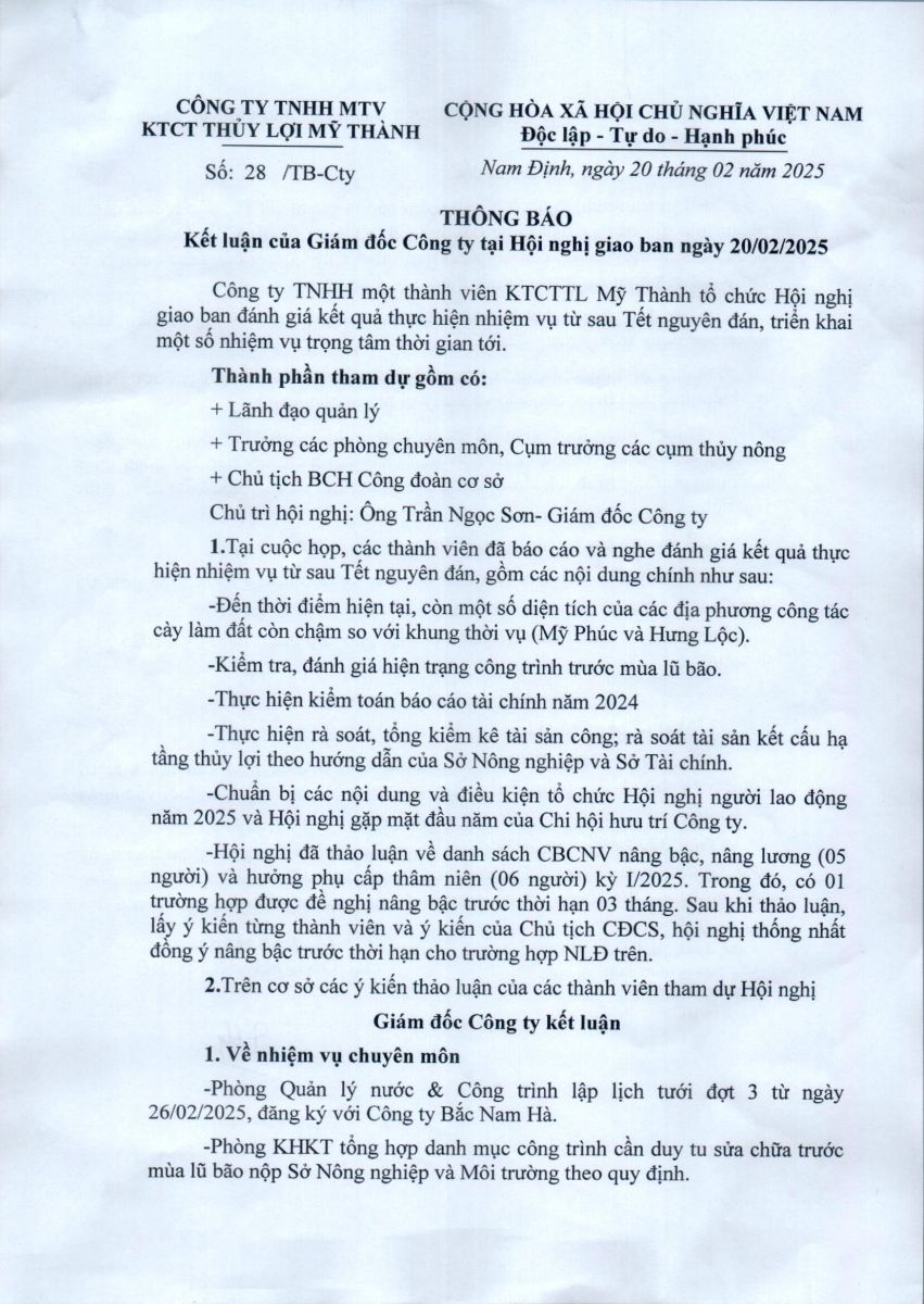 - Quyết định về việc phê duyệt danh mục, kế hoạch sửa chữa thường xuyên công trình thuỷ lợi năm 2026 của Công ty TNHH MTV KTCTTL Mỹ Thành