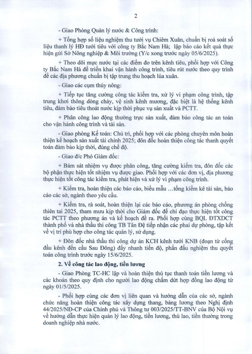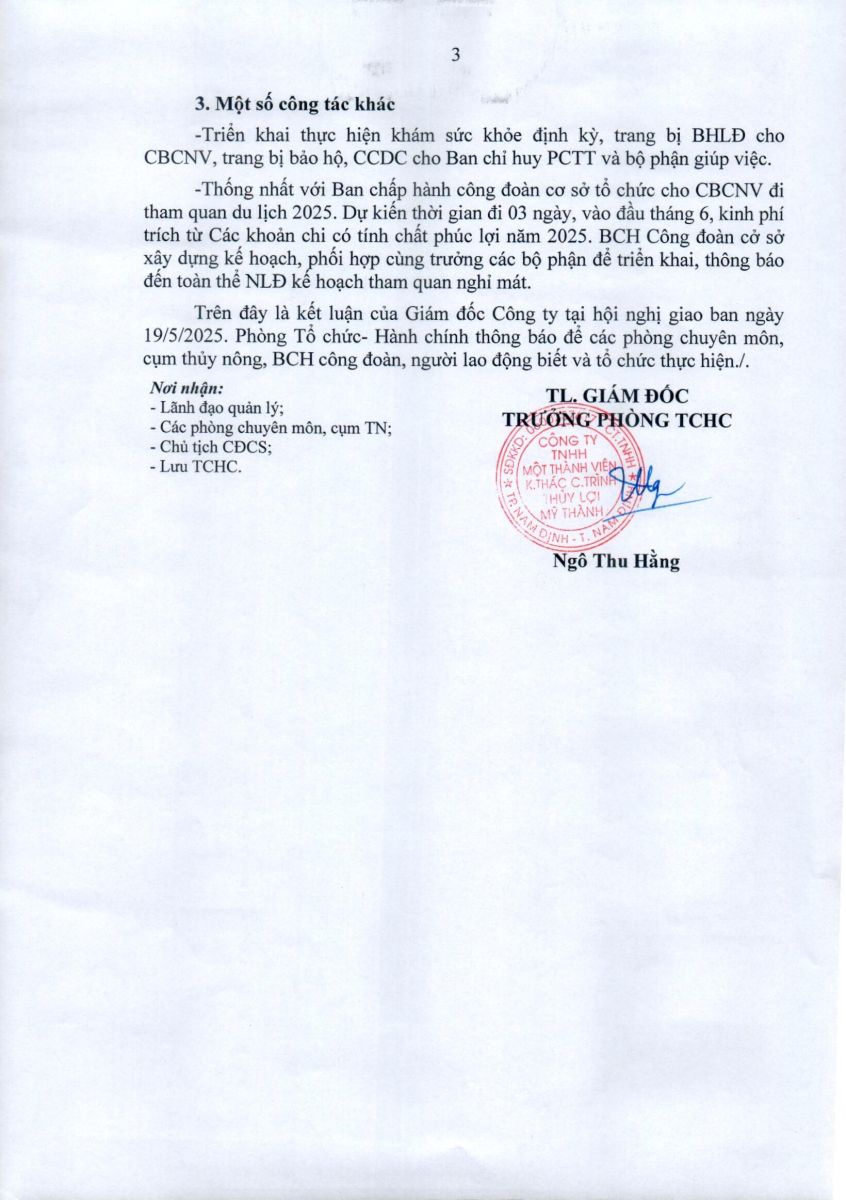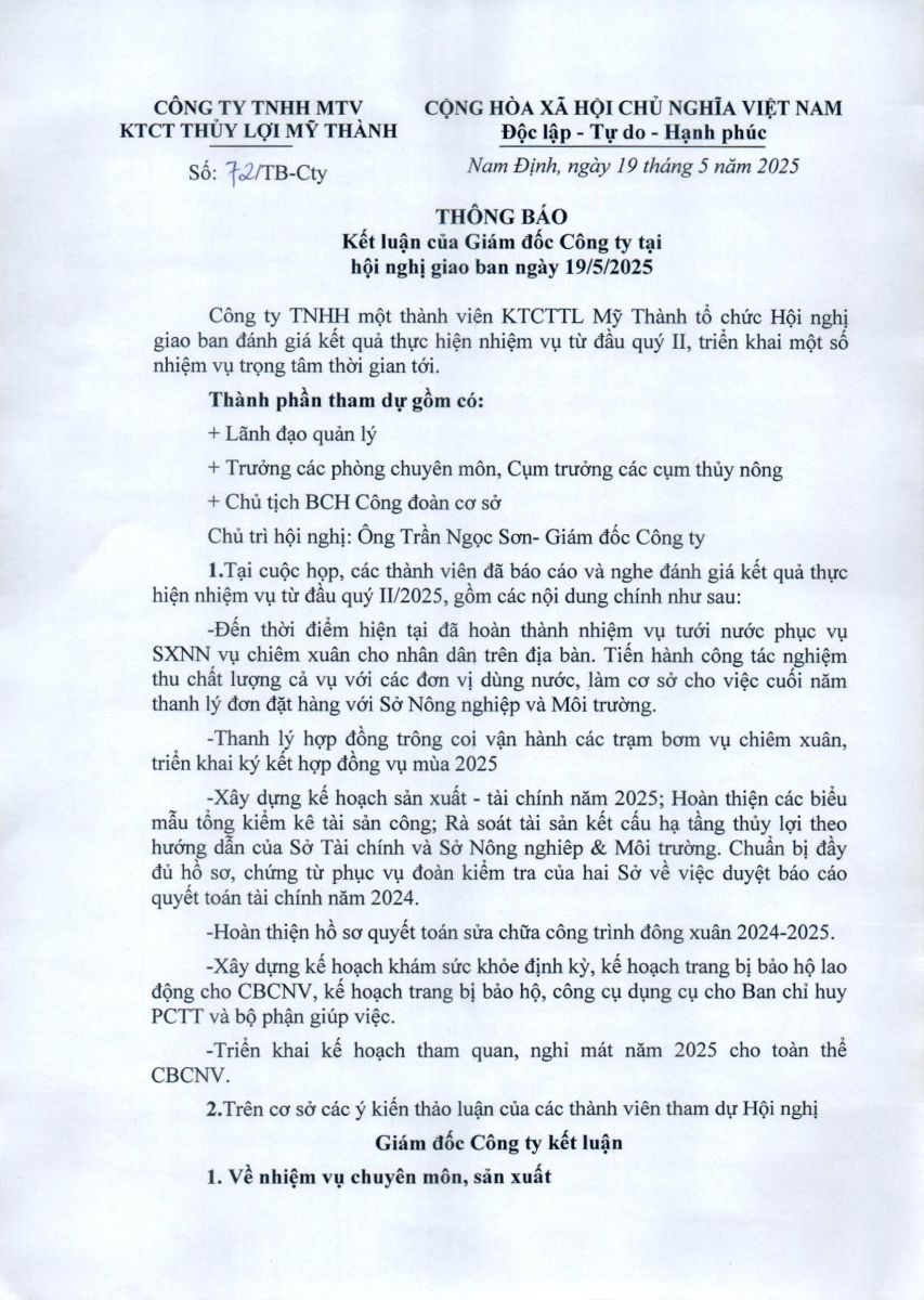• Thông báo kết luận của Giám đốc Công ty tại Hội nghị giao ban ngày 19/5/2025