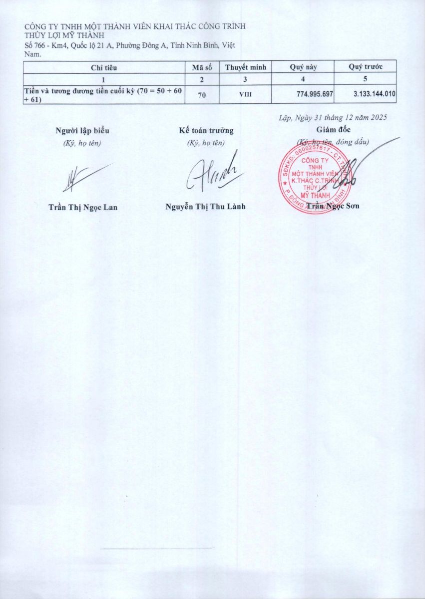 - Quyết định về việc phê duyệt danh mục, kế hoạch sửa chữa thường xuyên công trình thuỷ lợi năm 2026 của Công ty TNHH MTV KTCTTL Mỹ Thành