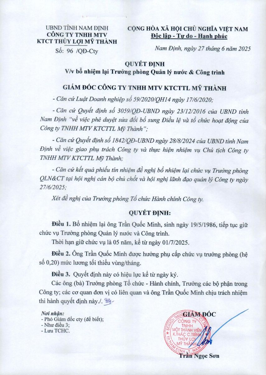 - Quyết định về việc bổ nhiệm lại Trưởng phòng Quản lý nước & Công trình