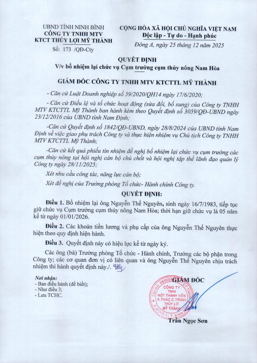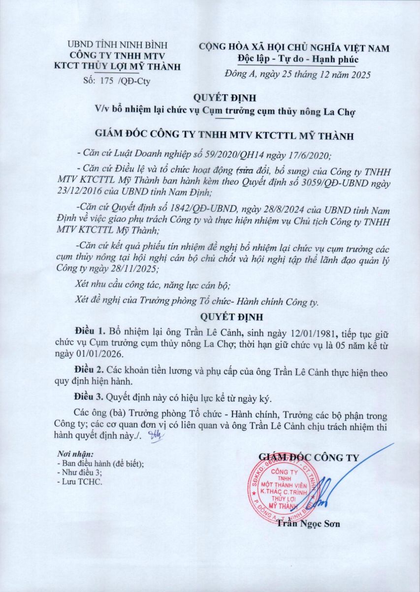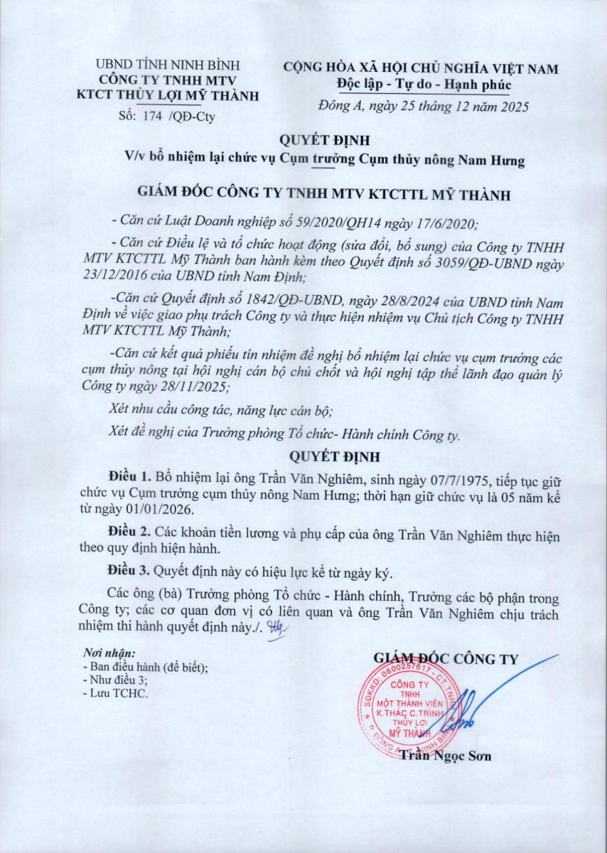 - Quyết định về việc bổ nhiệm lại chức vụ Cụm trưởng cụm thuỷ nông