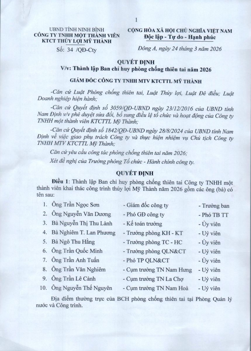 - Quyết định về việc thành lập Ban chỉ huy phòng chống thiên tai năm 2026
