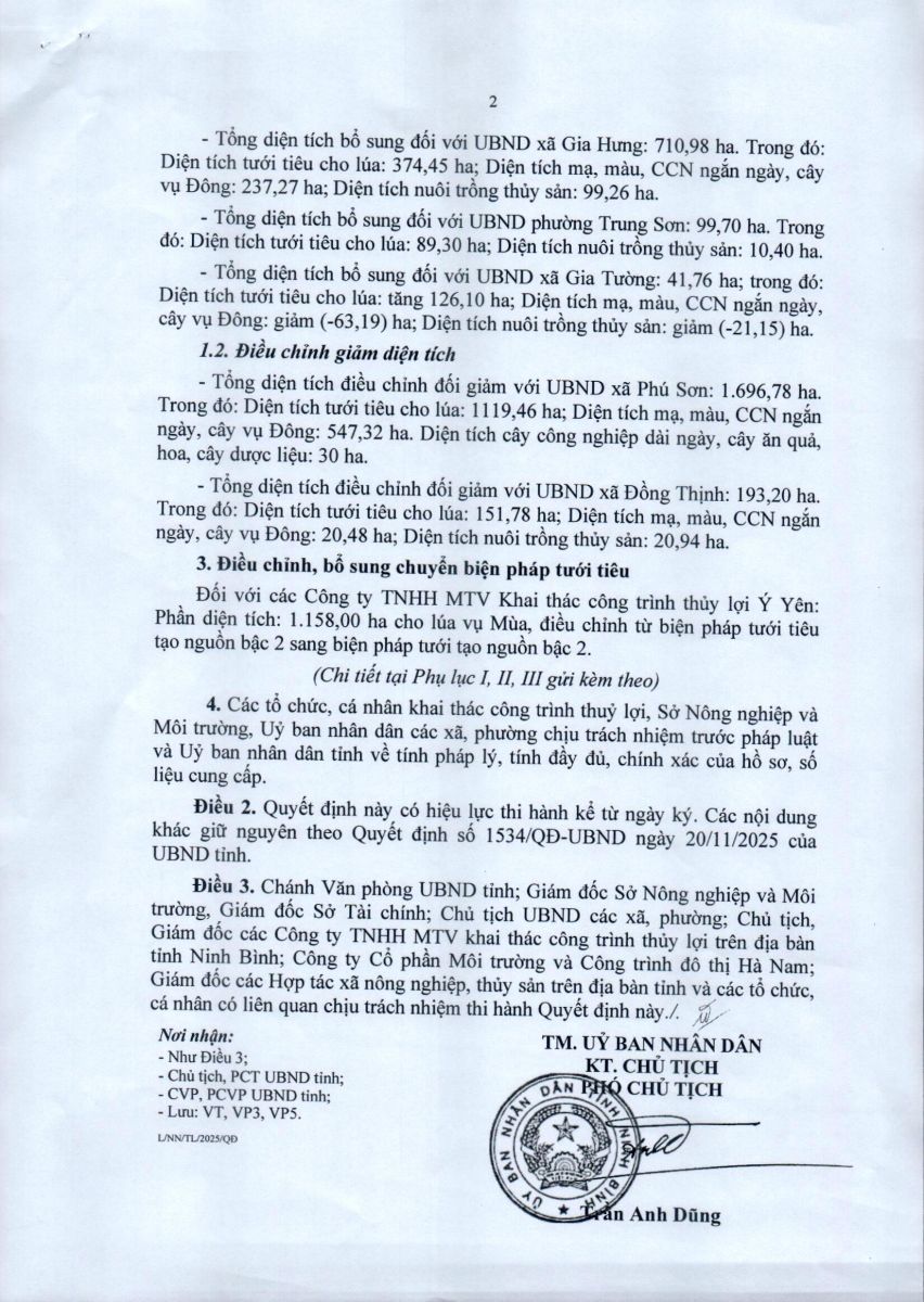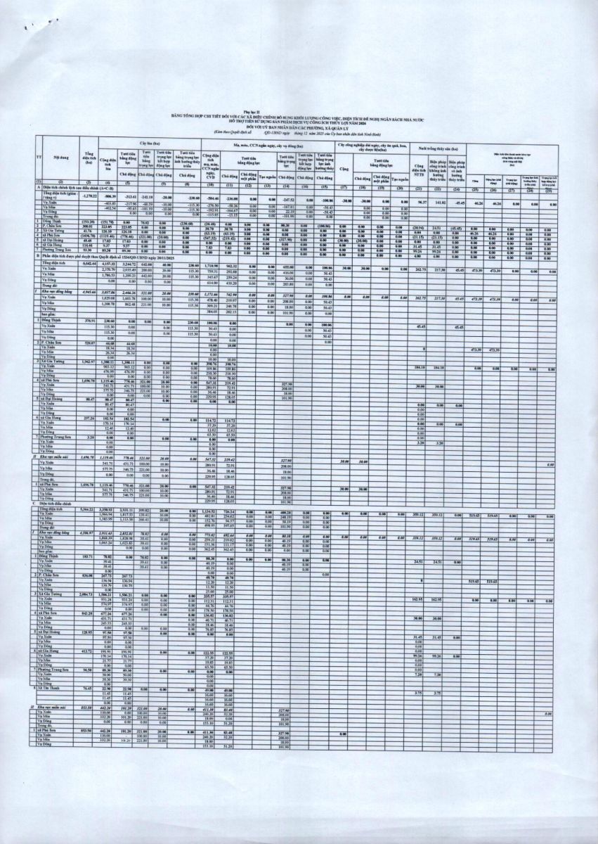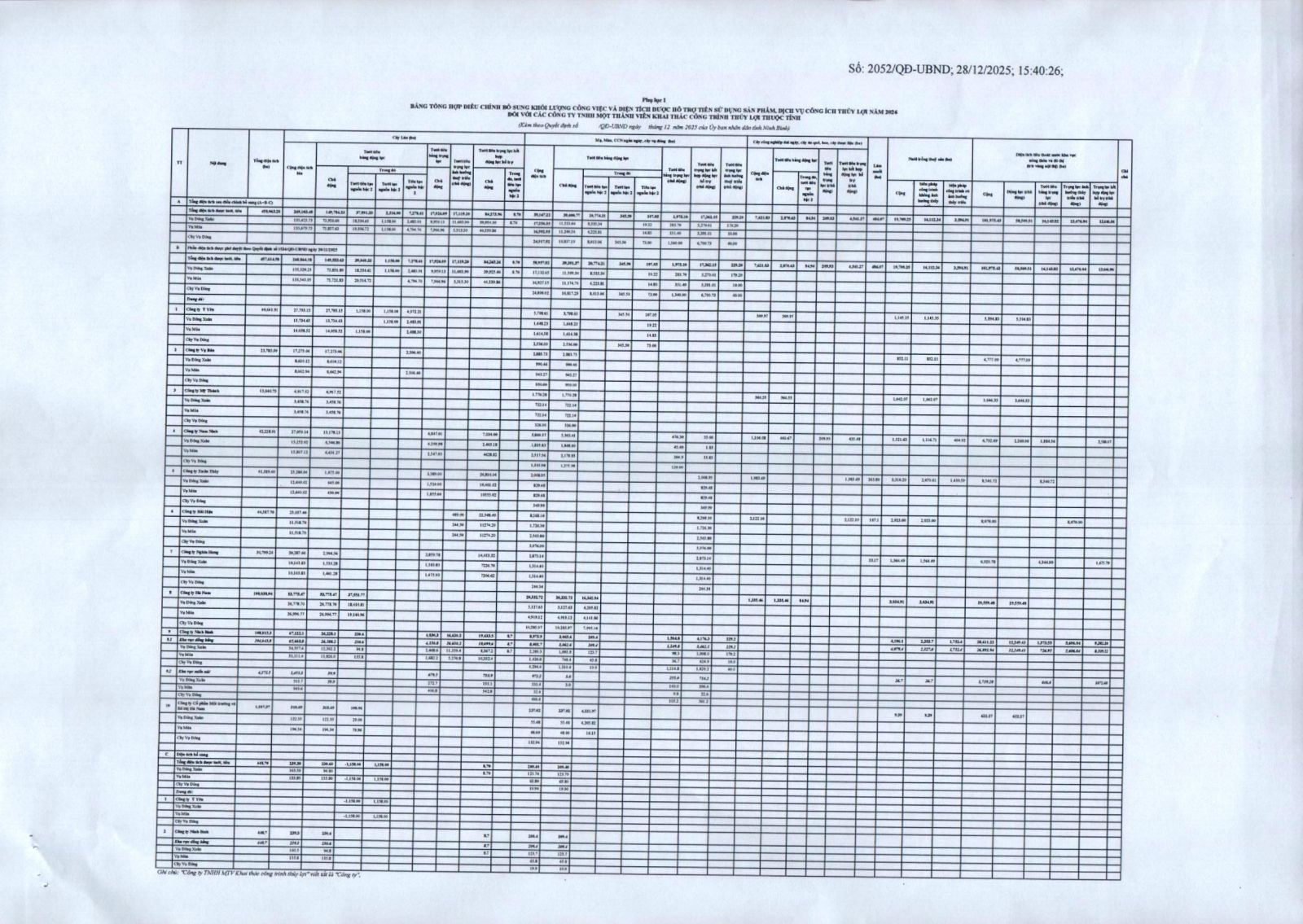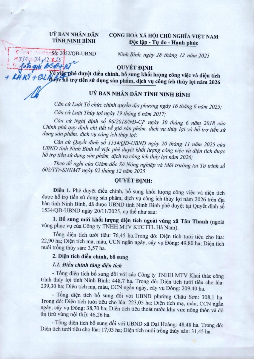 - Quyết định về việc phê duyệt điều chỉnh, bổ sung khối lượng công việc và diện tích được hỗ trợ tiền sử dụng sản phẩm, dịch vụ công ích thuỷ lợi năm 2026