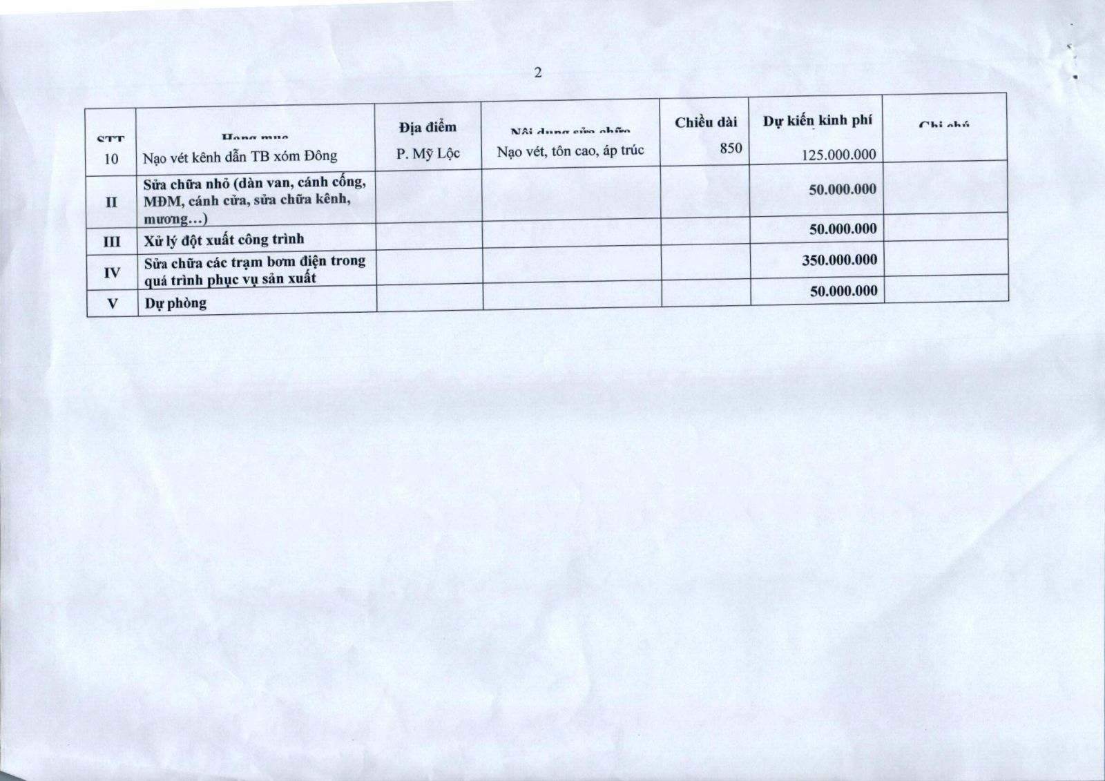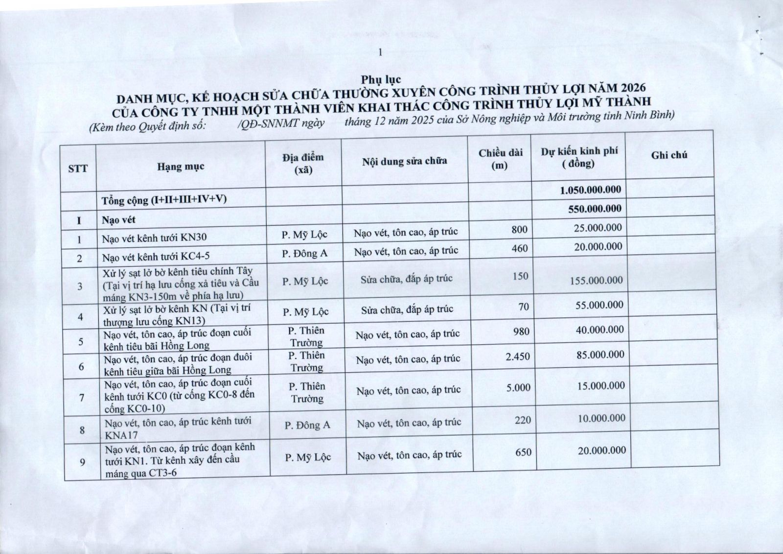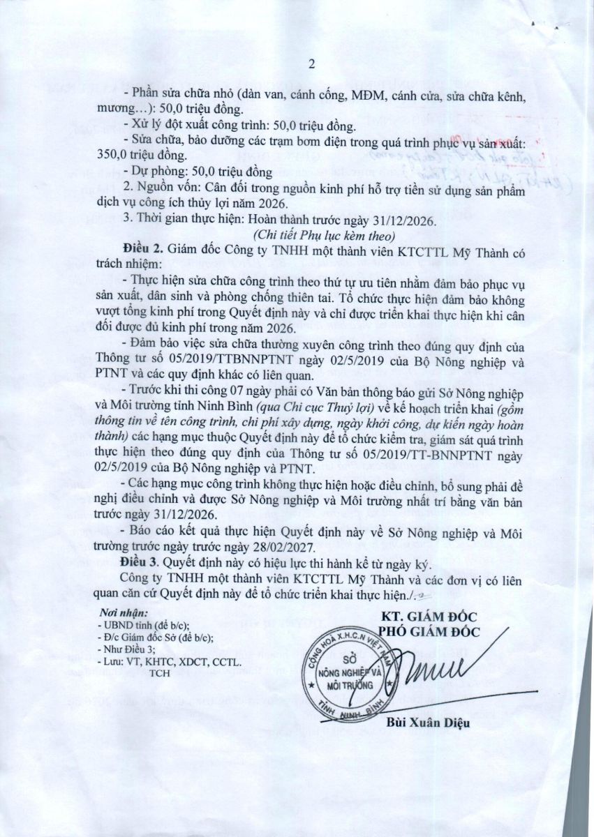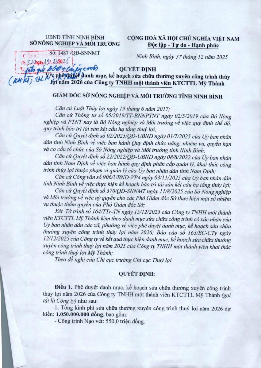 - Quyết định về việc phê duyệt danh mục, kế hoạch sửa chữa thường xuyên công trình thuỷ lợi năm 2026 của Công ty TNHH MTV KTCTTL Mỹ Thành